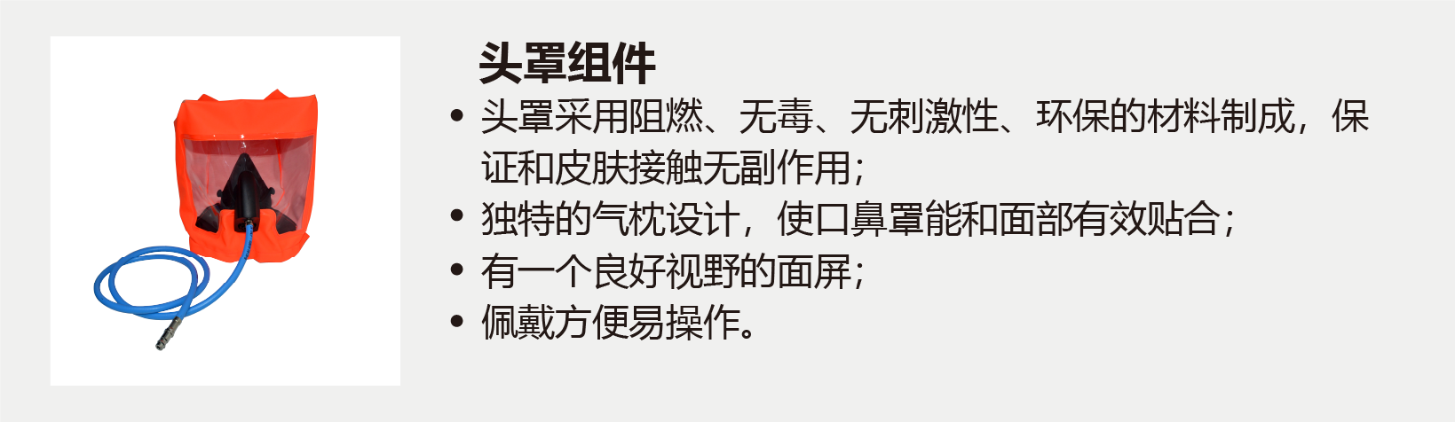本產(chǎn)品是搶險(xiǎn)救災(zāi)以及突發(fā)事故時(shí)逃離危險(xiǎn)氣體及缺氧環(huán)境時(shí)使用,呼吸時(shí)使用氣瓶?jī)?nèi)的空氣,不依賴外界環(huán)境氣體,以恒定的流量向頭罩內(nèi)供氣,供使用人員呼吸。